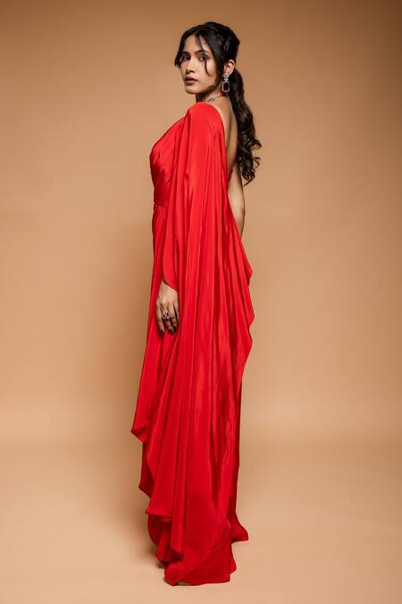 Buy_Ellemora Fashions_Red Natural Crepe Solid Cowl Asymmetric Sleeve Draped Dress _Online_at_Aza_Fashions