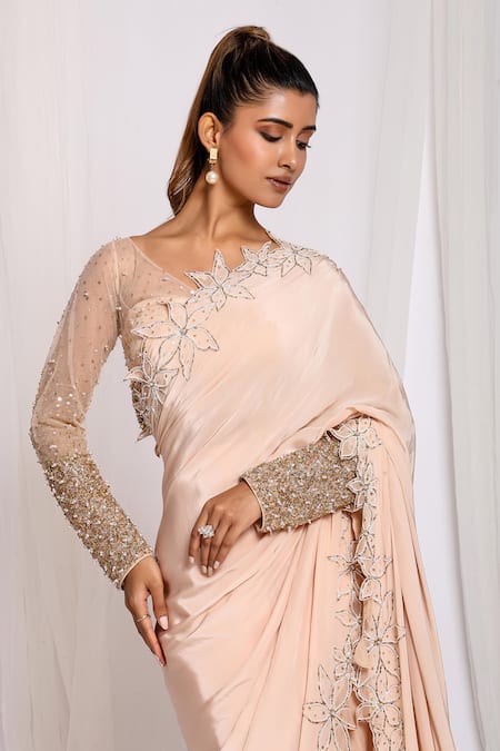 Intricate flower cutdana embroidery on saree border, Padded blouse with dazzling hand work, Back plunged neck with tie-up detail