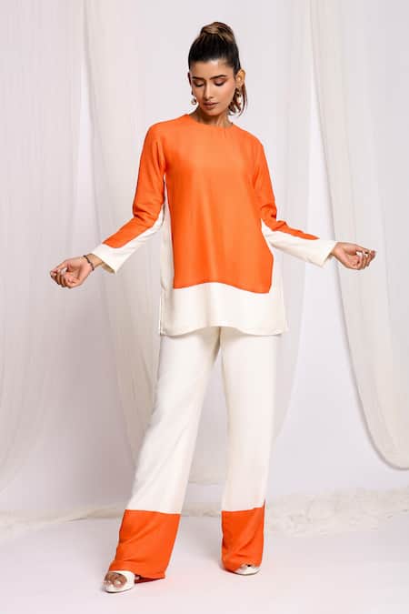Orange and white color block top made of linen featuring a round neckline and full sleeves. Paired with coordinating pants that have a solid design.