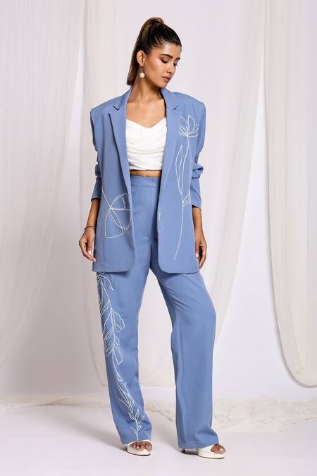 Blue blazer featuring white cutdana work embroidery, paired with matching pant and a white padded cowl top. The blazer has a notched lapel and full sleeves, while the pant offers a relaxed fit.