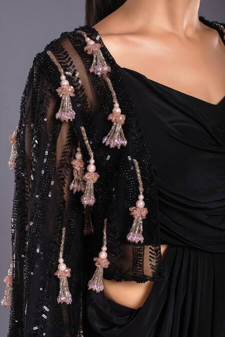 Black draped dress featuring cutdana hand embroidery and flared sleeves