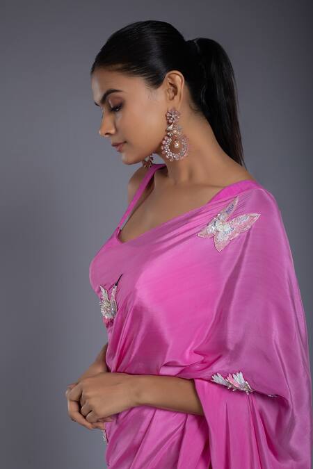 Pink saree featuring hand embroidered bird and butterfly motifs with sequins and cutdana work. Paired with a sleeveless blouse with a back tie-up closure.