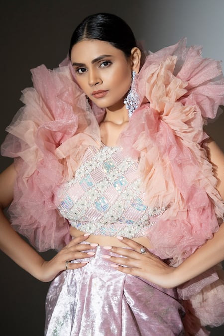 Pink embellished blouse featuring pearl and sequin geometric motifs. Paired with a shimmer draped skirt and a ruffle two-tone dupatta.