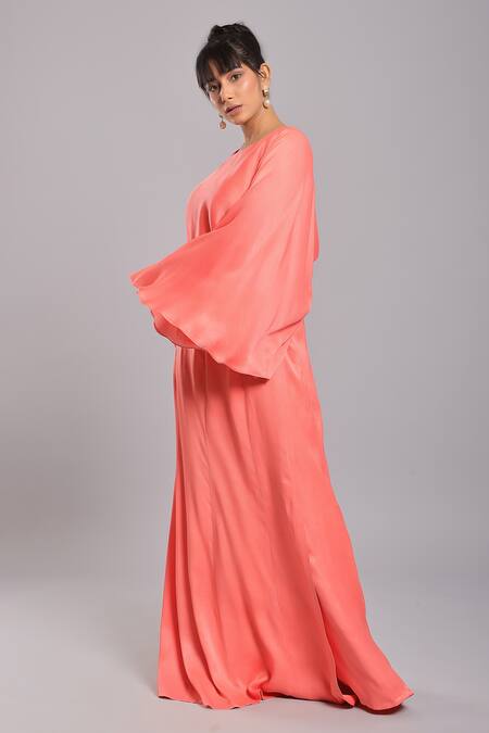 Coral Dull Crepe Plain Boat Neck Layered Cape And Draped Skirt Set