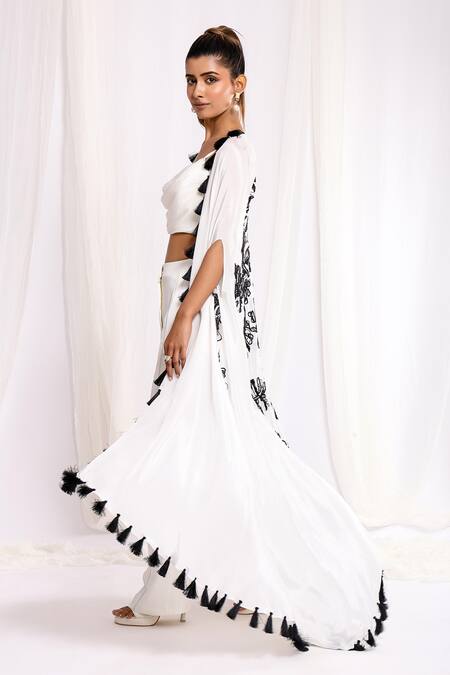 White embroidered shrug featuring intricate leaf motifs and black tassels. Paired with a padded cowl neck top and straight pant.