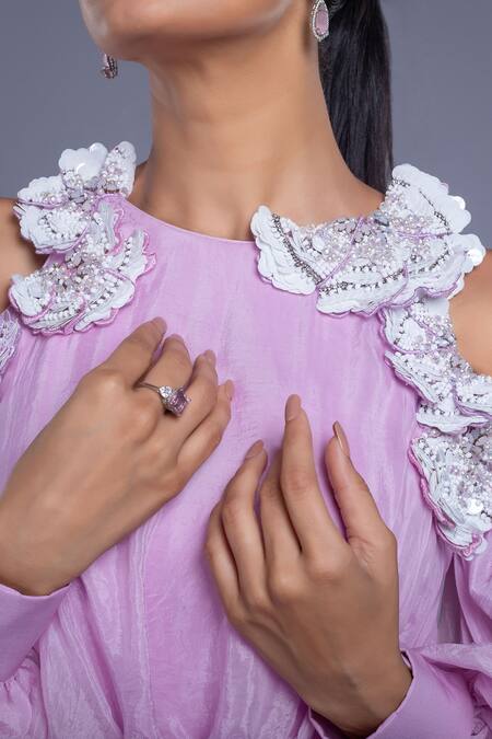 Lavender jumpsuit featuring cold shoulder sleeves and sequins, beaded patchwork hand embroidery