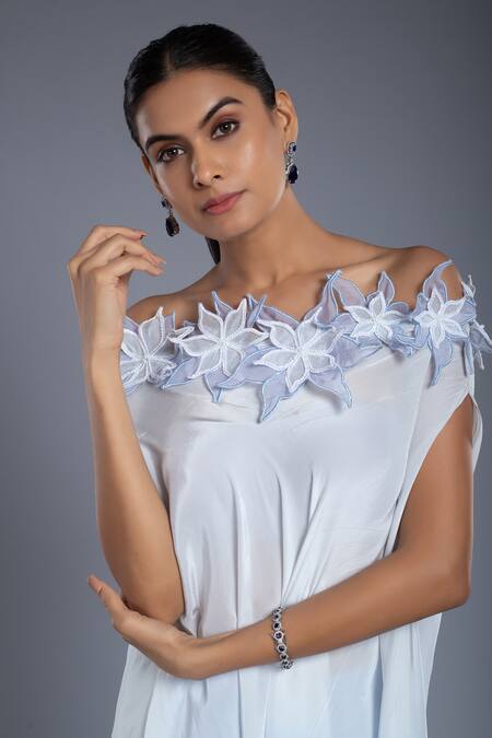 Sky blue off-shoulder kaftan featuring floral and cutdana patchwork hand embroidery. Paired with a coordinating tulip pant.
