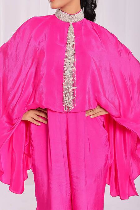 Hot pink cape jumpsuit featuring batwing sleeves and pearl tassel embroidery. Designed with a round high neck and a back zipper closure.