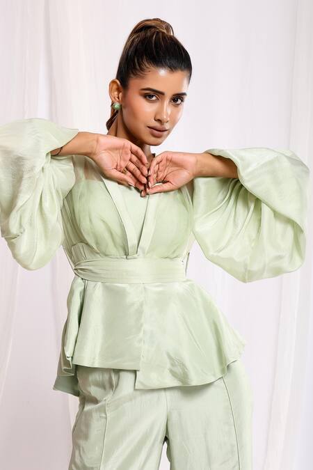 Pastel green sheer peplum jacket featuring bishop bell sleeves. Paired with a coordinating palazzo and padded crop top.