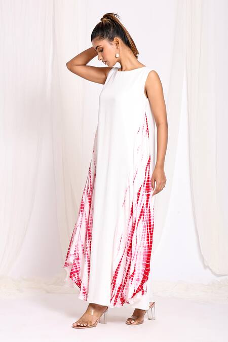 White ankle length dress featuring fuchsia pink shibori flared panels on both sides