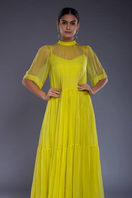 Lime green flared maxi dress featuring a high collar and half sleeves. Comes with an inner lining for added comfort.