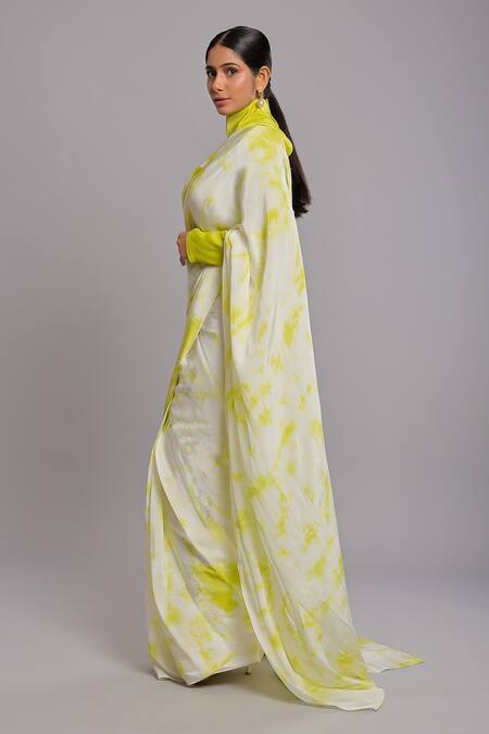Green tie dye pre-draped saree featuring a turtle neck padded blouse. The saree length is 44 inches and the blouse measures 14 inches.