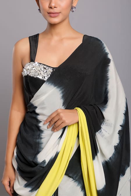 Black and white pre-draped saree featuring a tie-dye stripe pattern. Paired with a padded corset blouse adorned with sequin, cutdana, and bead embroidery.