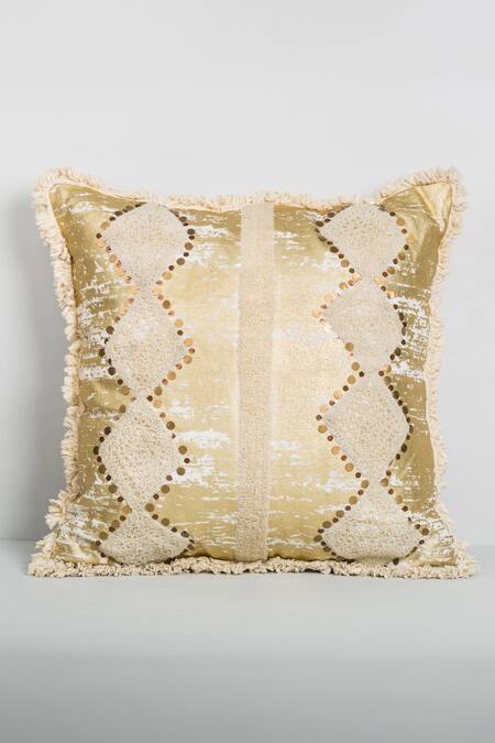 Cream, gold colorblock square shaped cushion cover with abstract foil print & sequin embroidery.