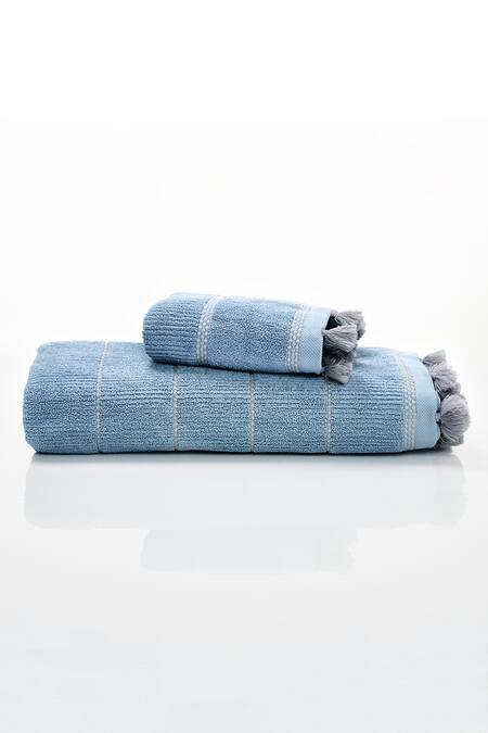 Rectangle shaped, Tassel border, Dimensions W X L :, Hand - 38 X 60 cm, Bath - 70 X 150 cm, Note: Only the blue towel set is being sold