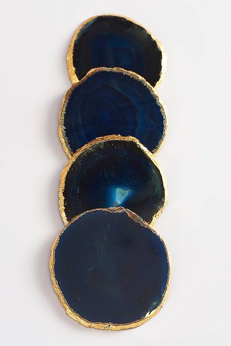 Blue hand-carved agate stone coasters electroplated with thick metallic gold.