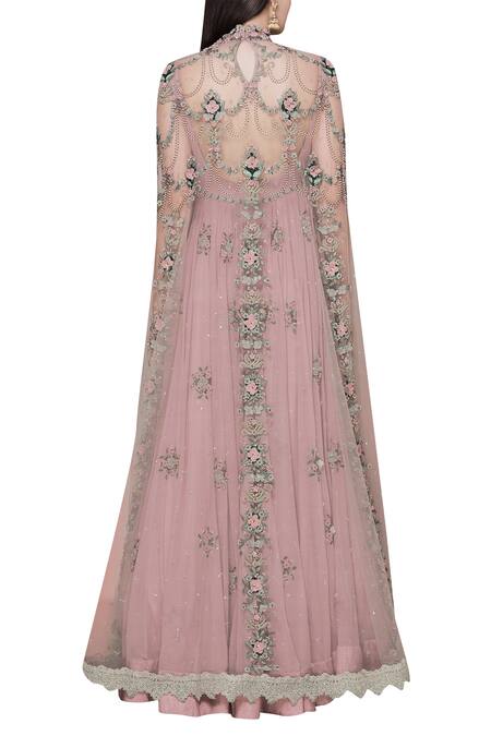 Pink anarkali style gown with all over 3D floral motif work & attached cape.