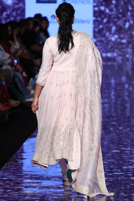 Powder pink flared anarkali with zari embroidered motifs & mirror work. Comes with churidar & dupatta.