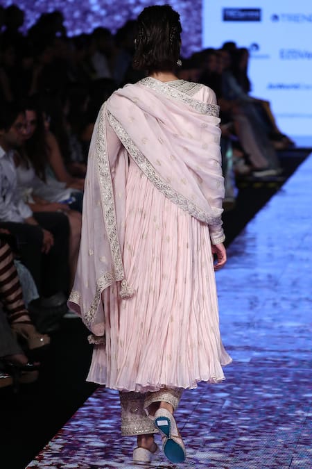 Powder pink flared anarkali with all-over embellishment. Comes with straight pants & dupatta.