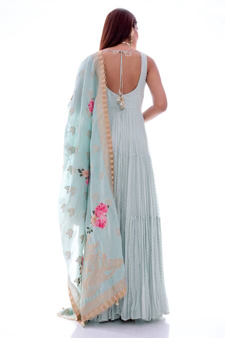 Pastel aqua blue teir anarkali with overall gold dew dots embellished. Paired with floral banarasi patch duptta and a crepe pant.
