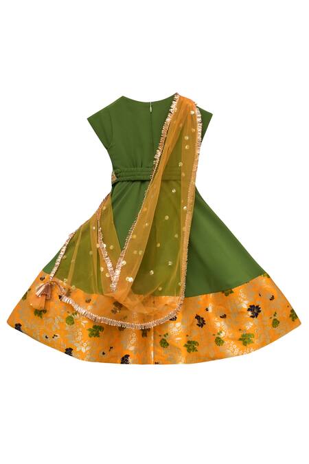 Green anarkali with floral print detail. Paired with embellished dupatta & belt.