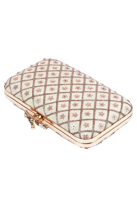 Beige box clutch featuring all-over 3D floral motif work in a checkered pattern