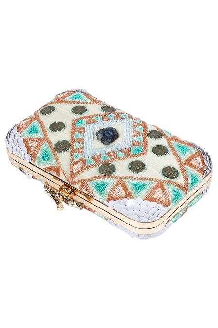 Multi color box clutch featuring all-over geometric motif bead work