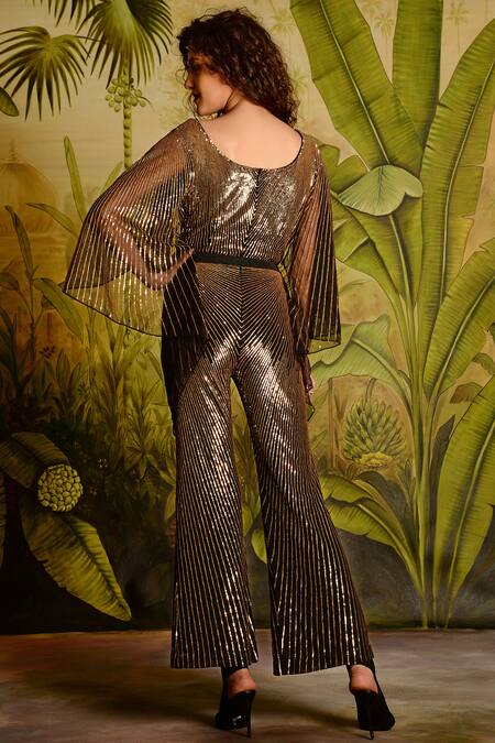 Black jumpsuit with gold stripes all over & cape-style sleeves.