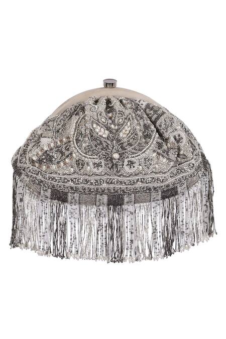 Silver clutch with all over luminous Japanese micro bead and baroque pearl work.