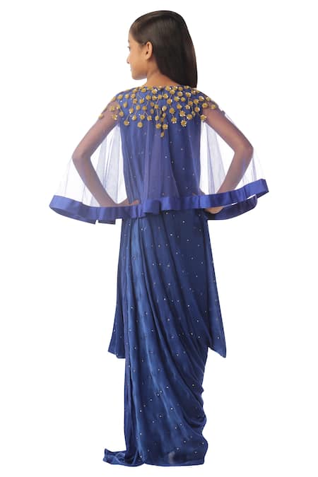 Blue Chiffon, Net Embroidery Embellished Dress With Cape