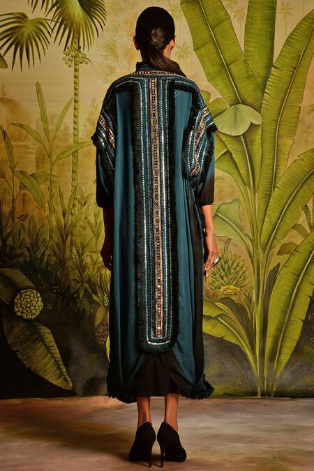 Black midi dress with placement mirror & thread work. Comes with embroidered blue long jacket enhanced with fringe detail.