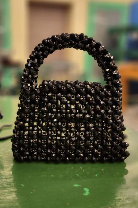 Black mini handbag featuring acrylic bead embellishments and a flap closure
