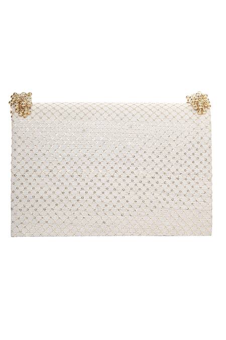 White flap clutch featuring sequin-thread embroidery in a checkered pattern