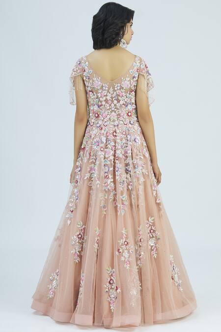 Old rose flared gown with sequin & cutdana embellished floral motifs.
