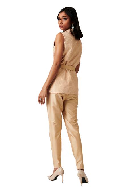 Beige sleeveless jacket with cutdana, bead & sequin embellished detail. Paired with pant.