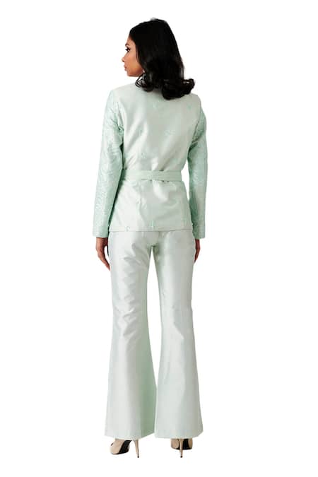 Mint layered jacket with cutdana, bead & sequin embellished & pintuck detail. Paired with bell-bottom pant.