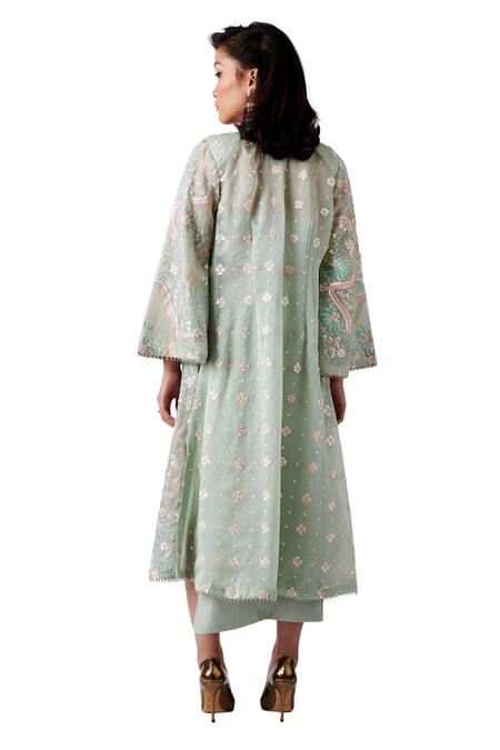 Buy_Amaare_Green Taffeta Embroidery Open Embellished Jacket And Skirt Set _at_Aza_Fashions