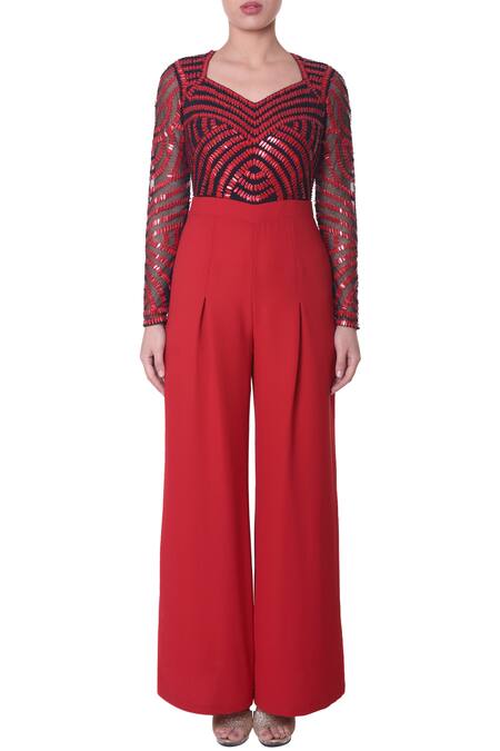 Buy_Platinoir_Red Heavy Crepe Embellished Jumpsuit_Online_at_Aza_Fashions