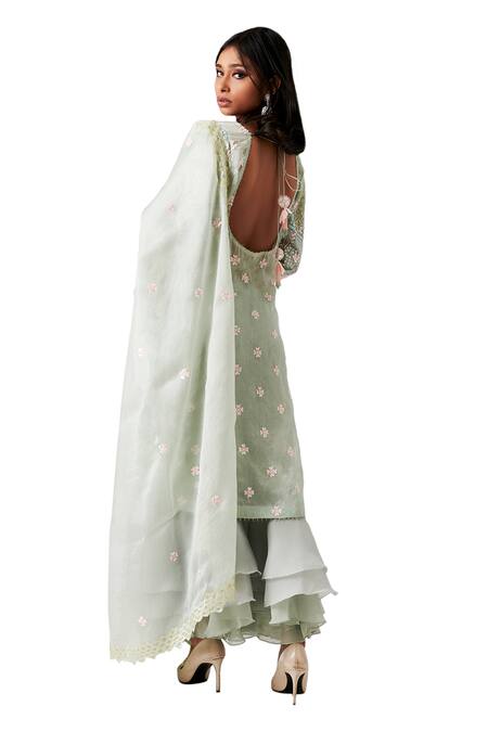 Pistachio kurta with cutdana, bead & sequin embellished detail & full sleeves. Paired with ruffle layered palazzo & embellished dupatta.