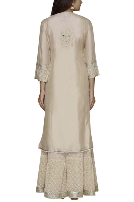 Beige Georgette, Dupion Silk Kurta Round Inner V Embellished Sharara Set