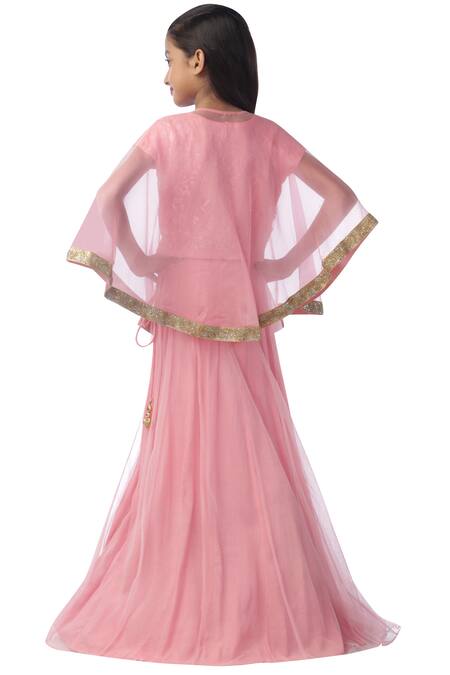 Buy_Kommal Sood_Pink Organza, Net, Lace Embroidery, Sequins Embellished Lehenga Set With Cape_Online_at_Aza_Fashions