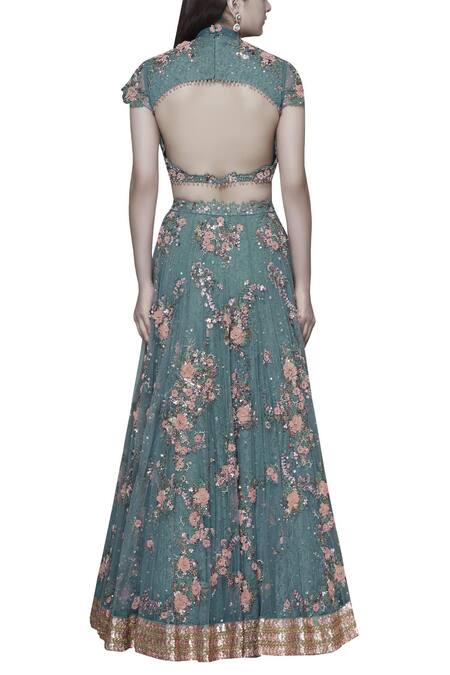 Teal backless blouse with all-over floral motif work. Paired with lehenga & cutwork border dupatta. This set comes with can-can skirt.