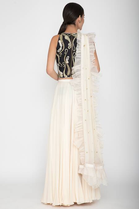 Black blouse with sequin embellishments & 3D motifs. Comes with flared ivory lehenga & net dupatta.