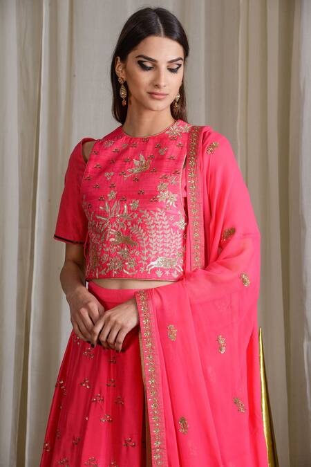 Pink Dupion Silk Embellished Thread Work Crew Neck Lehenga Set