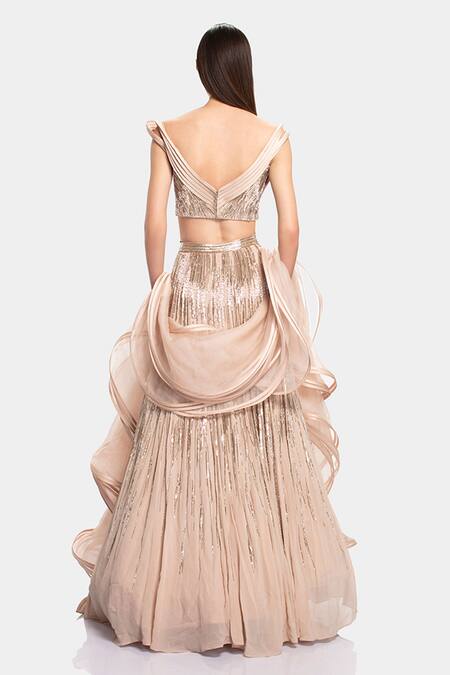Rose champagne lehenga with brushstroke hand embroidery enhanced with glass bugle beads. Comes with twisted boat neck blouse & ruffle dupatta.