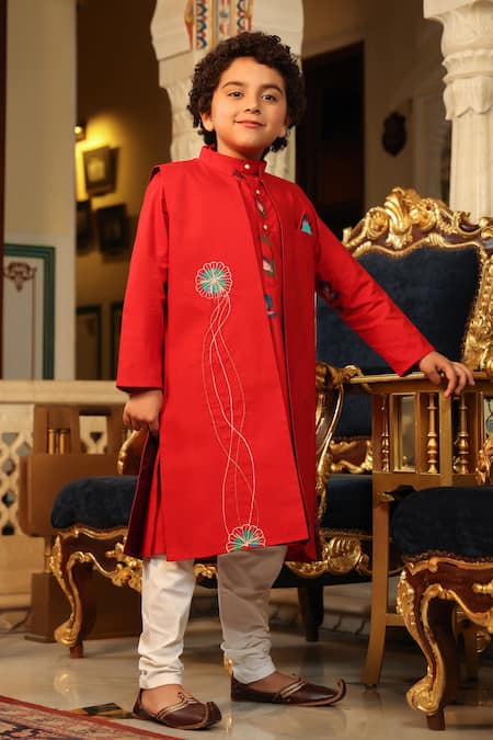 Buy_Cute Couture_Red Cotton, Poplin Beads Embroidered Bundi And Kurta Set _Online_at_Aza_Fashions