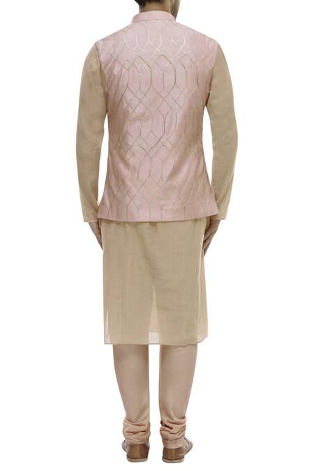 Baby pink Nehru jacket with geometric stripes paired with kurta. Comes with churidar & contrast pocket square.