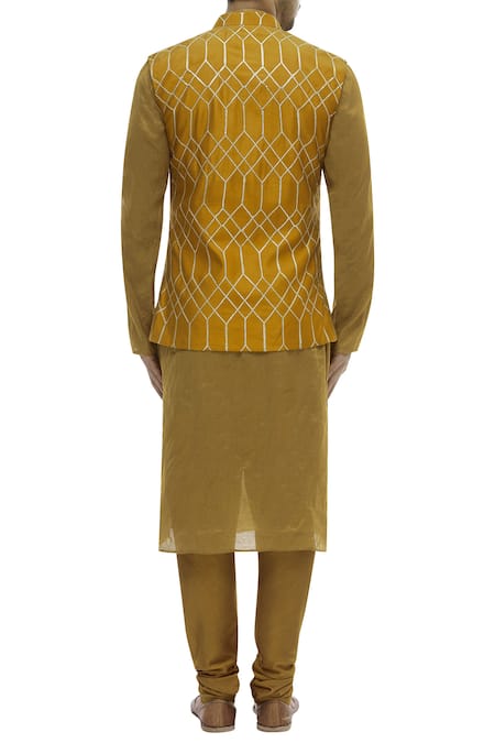 Mustard Nehru jacket with embroidered all over paired with kurta. Comes with churidar & contrast pocket square.