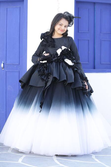 Black & white ombre gown with peplum bodice & 3D embellishment. Comes with head accessory.