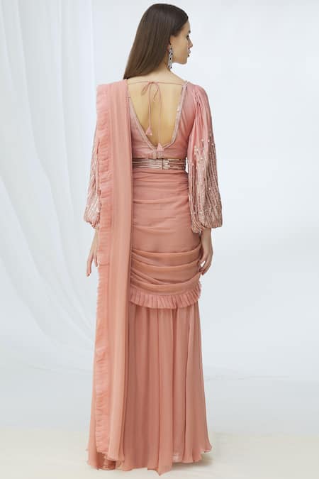 Pink pre-draped saree with pleated border. Comes with embellished blouse & belt.